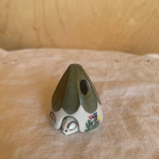 Olive Ceramic Mouse House Cone Incense Burner With Flowers