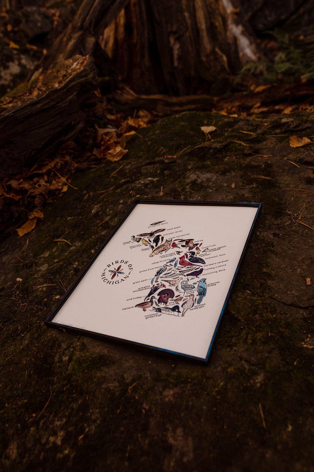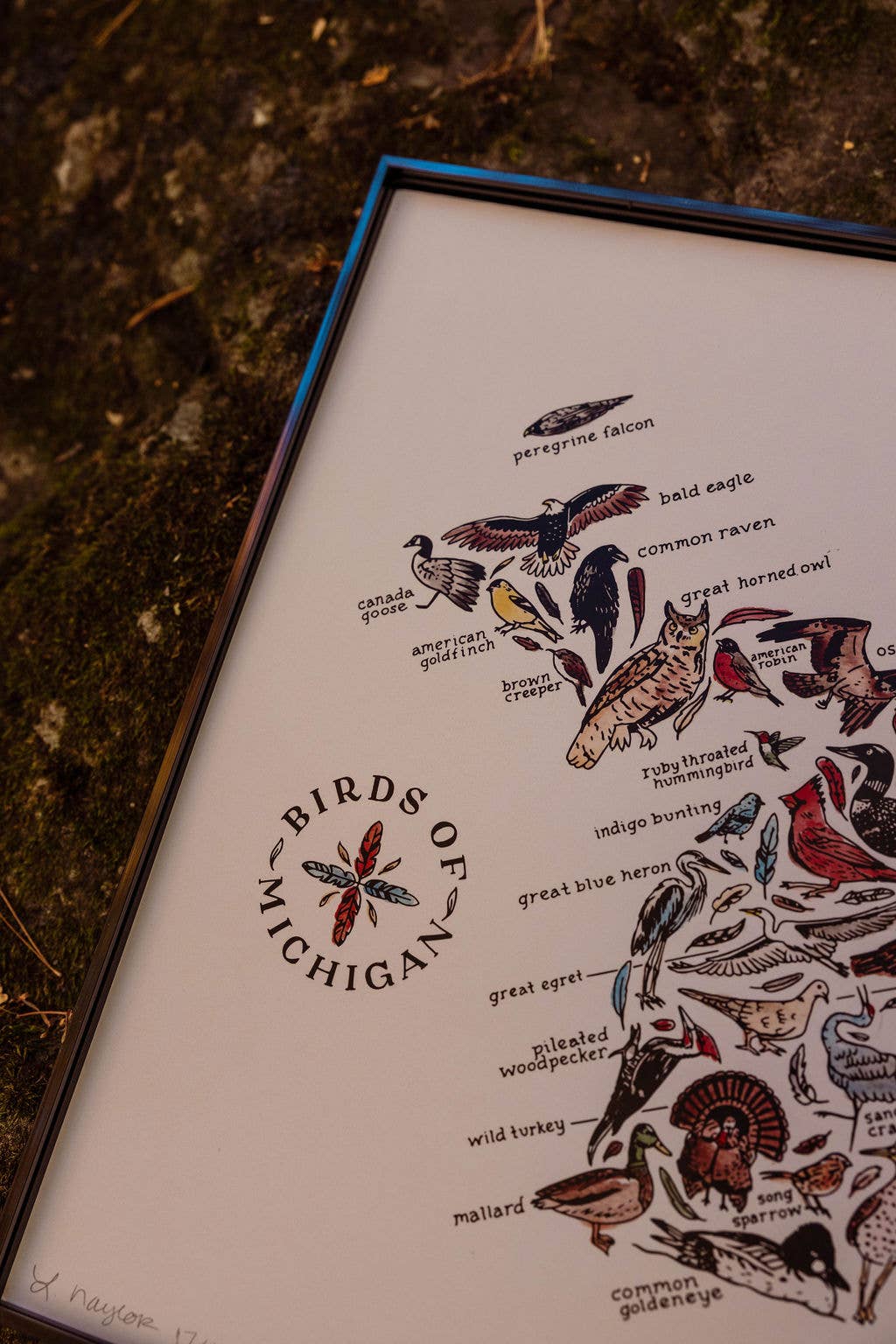 Featuring hand-drawn / painted illustrations of different birds throughout the state. The birds correspond to an area where they can be found.