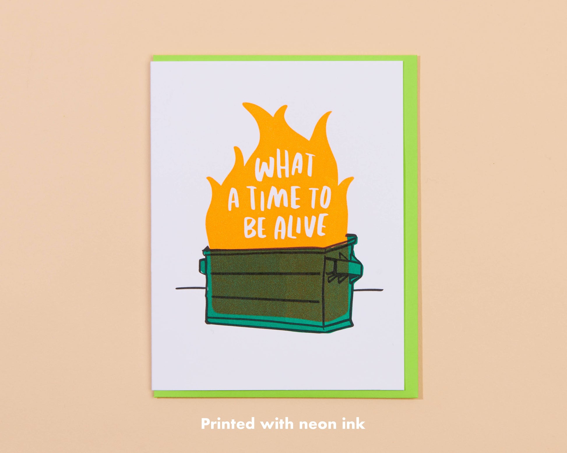 • Card reads: "What a time to be alive" inside the flame of a dumpster on fire.