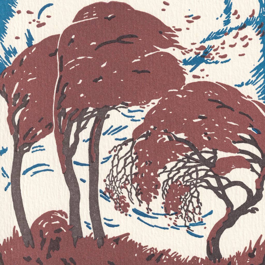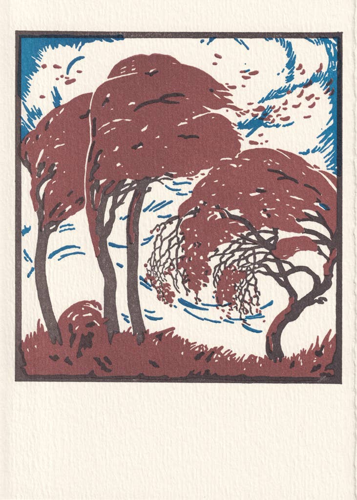 Dynamic trees bend against stormy skies in this dramatic letterpress card rendered in rich burgundy and deep blue tones. The movement and energy in the composition appeals to customers seeking cards with emotional impact and artistic flair. The letterpress printing emphasizes the wild, gestural quality of the wind-blown trees and turbulent sky.