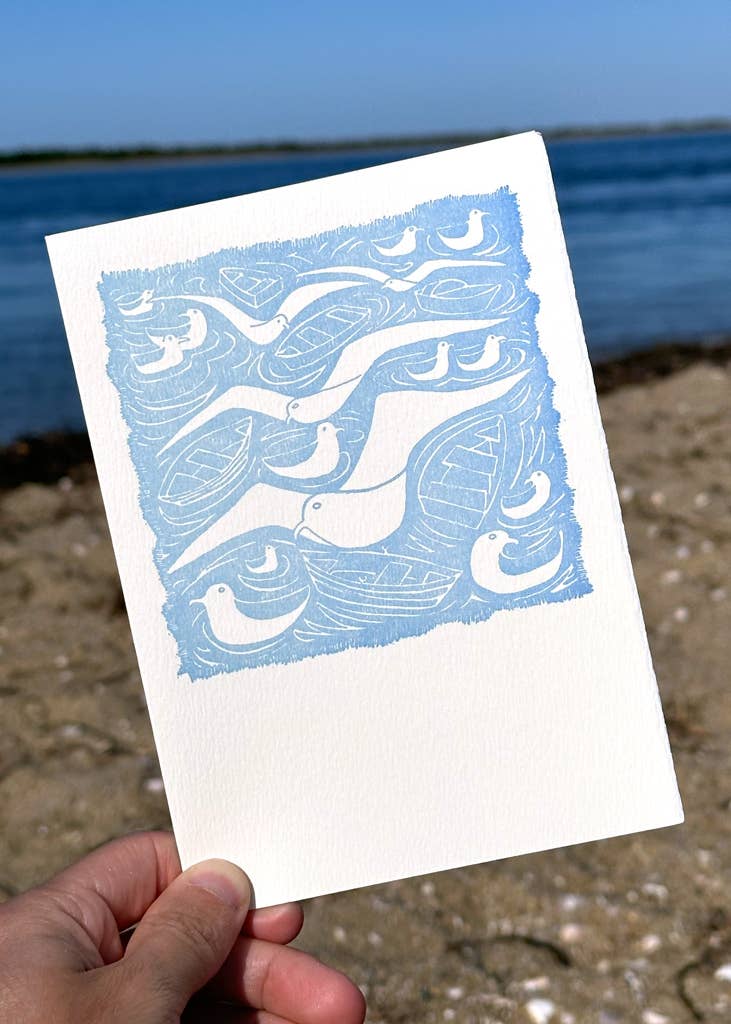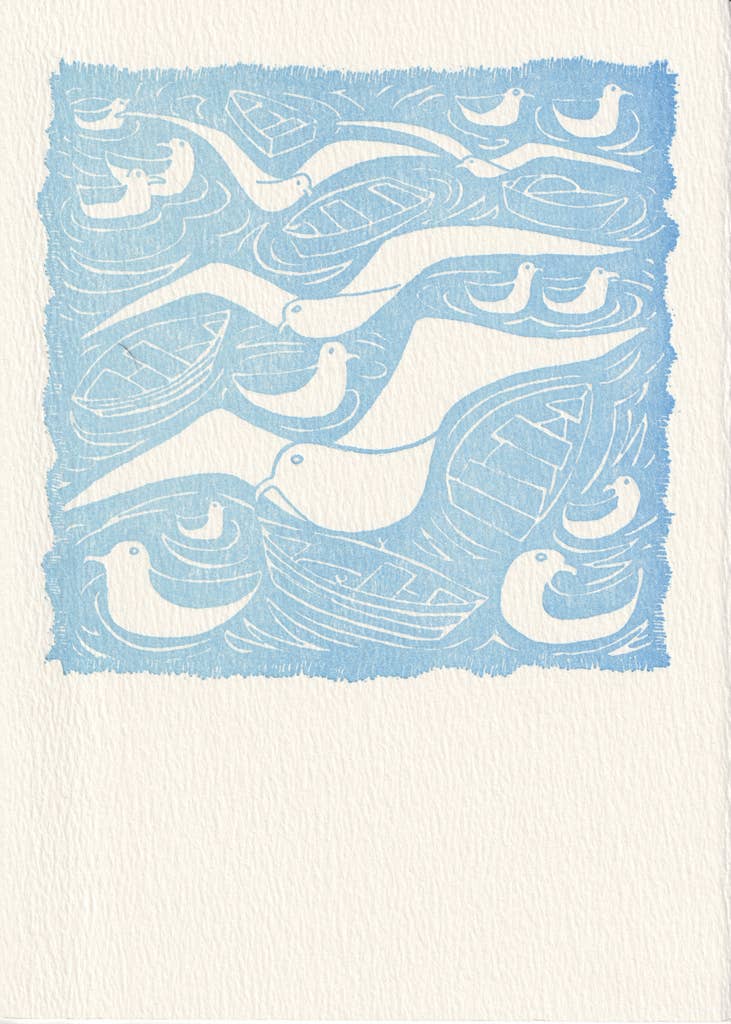 Charming maritime scene with stylized seagulls and sailboats in classic Arts & Crafts style. Intricate letterpress captures birds in flight and boat details in soft blue and white palette on heavy paper with natural edges.