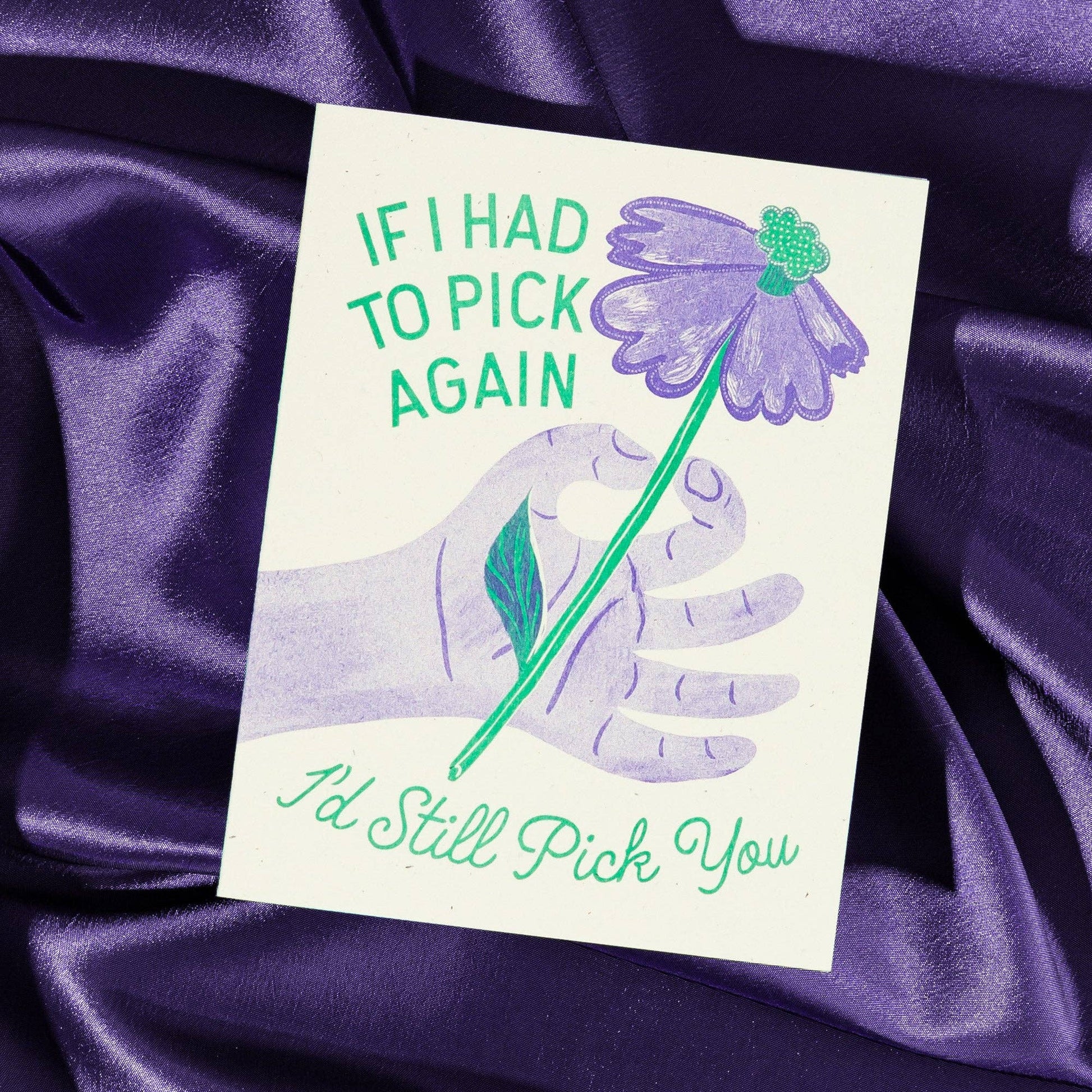 A hand plucks a single flower. This card is a confirmation of love, that even if there was a do-over, it would always be you. Risograph printed in seafoam and violet.