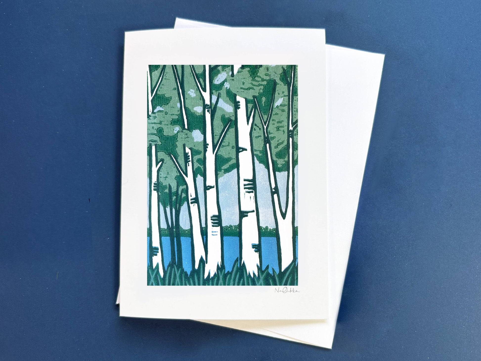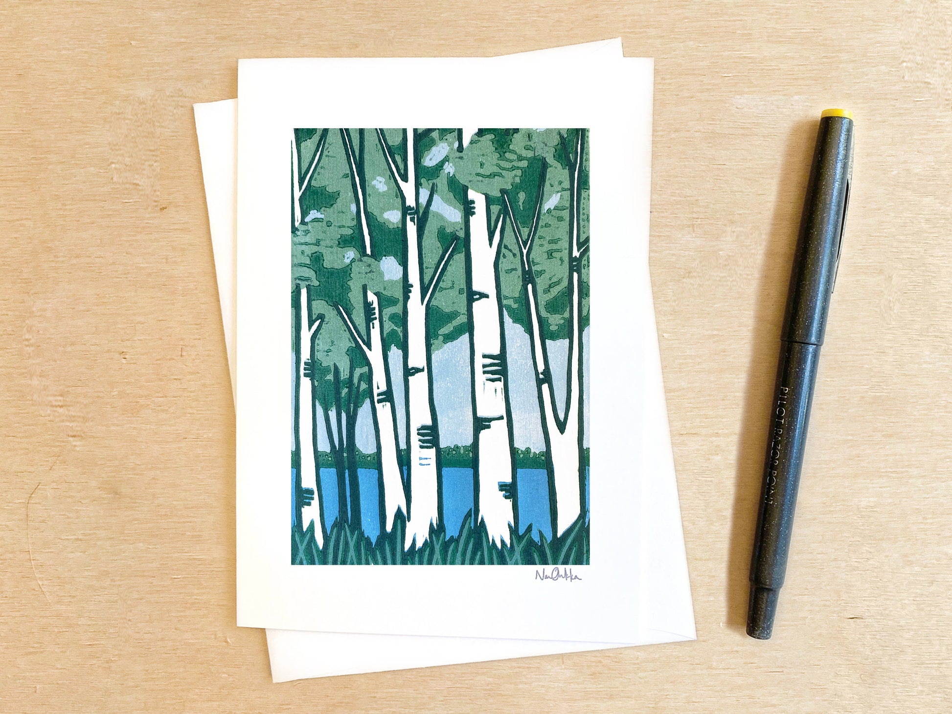 The greeting cards are printed locally in Minnesota at a green certified printer. The original image on the greeting card is a woodcut print. Nan creates the image by carving an image out of wood and printing it by hand onto paper. Nan works out of her home studio in Grand Marais, Minnesota. Your customers will love how versatile these cards are for any occasion.