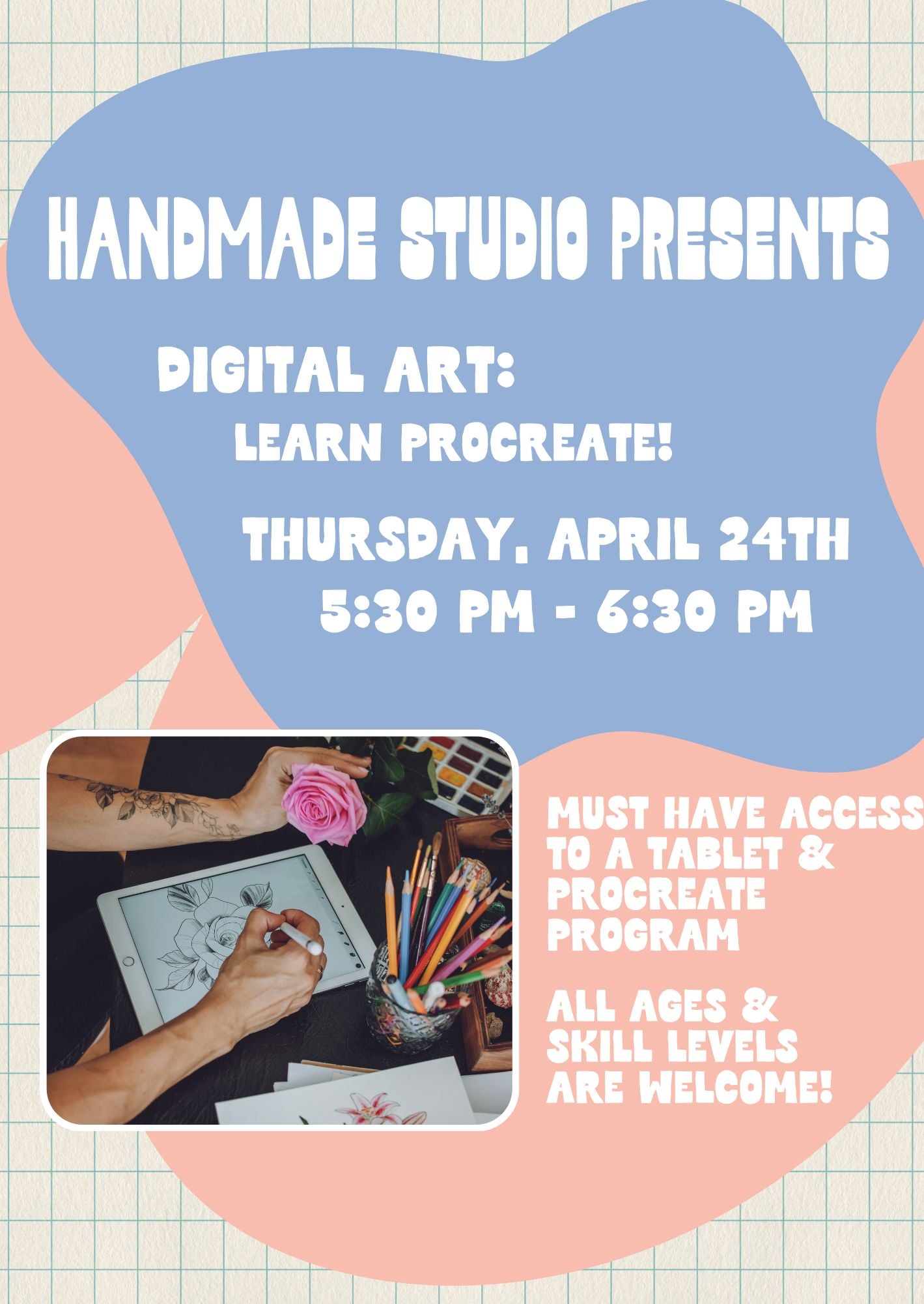 Bring your own tablet with Procreate installed, and get ready to explore a new creative medium!