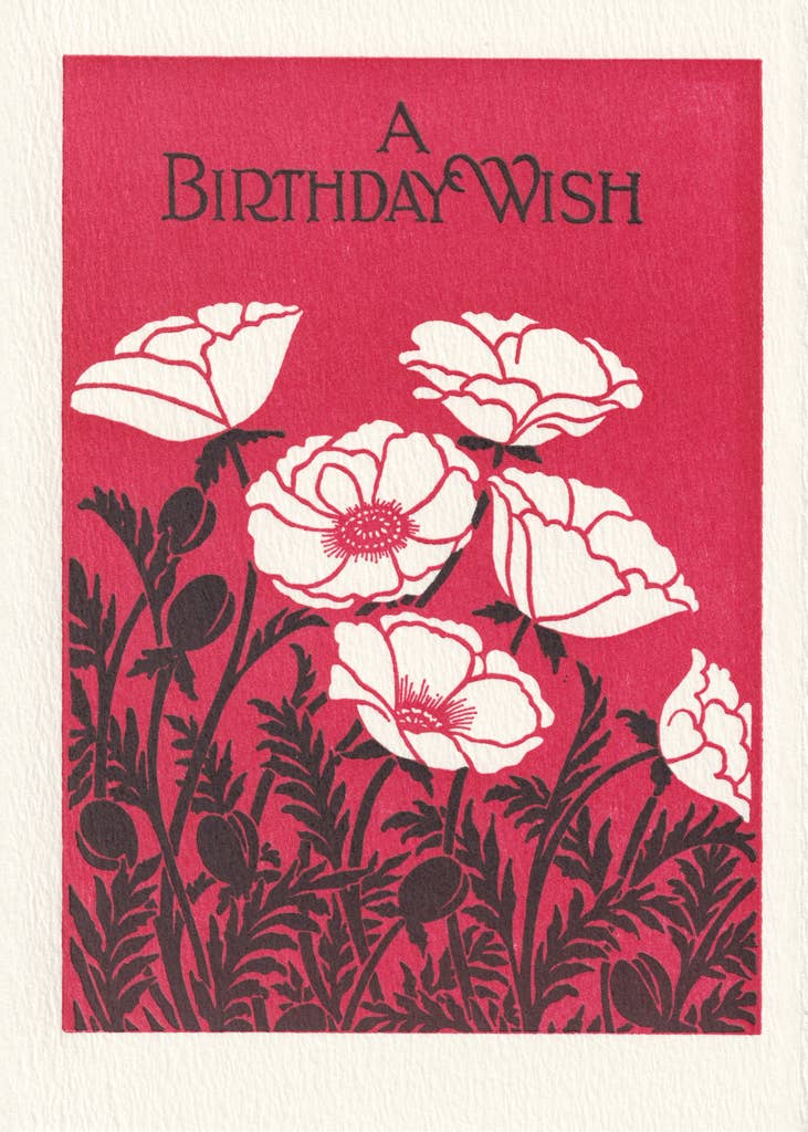 Bold red poppies create a striking and memorable birthday greeting that stands out in any card display. The letterpress technique brings remarkable depth to the flower petals and stems, while the rich red background creates dramatic visual impact. This card appeals to customers who love bold florals, vintage-inspired design, and high-quality printing.