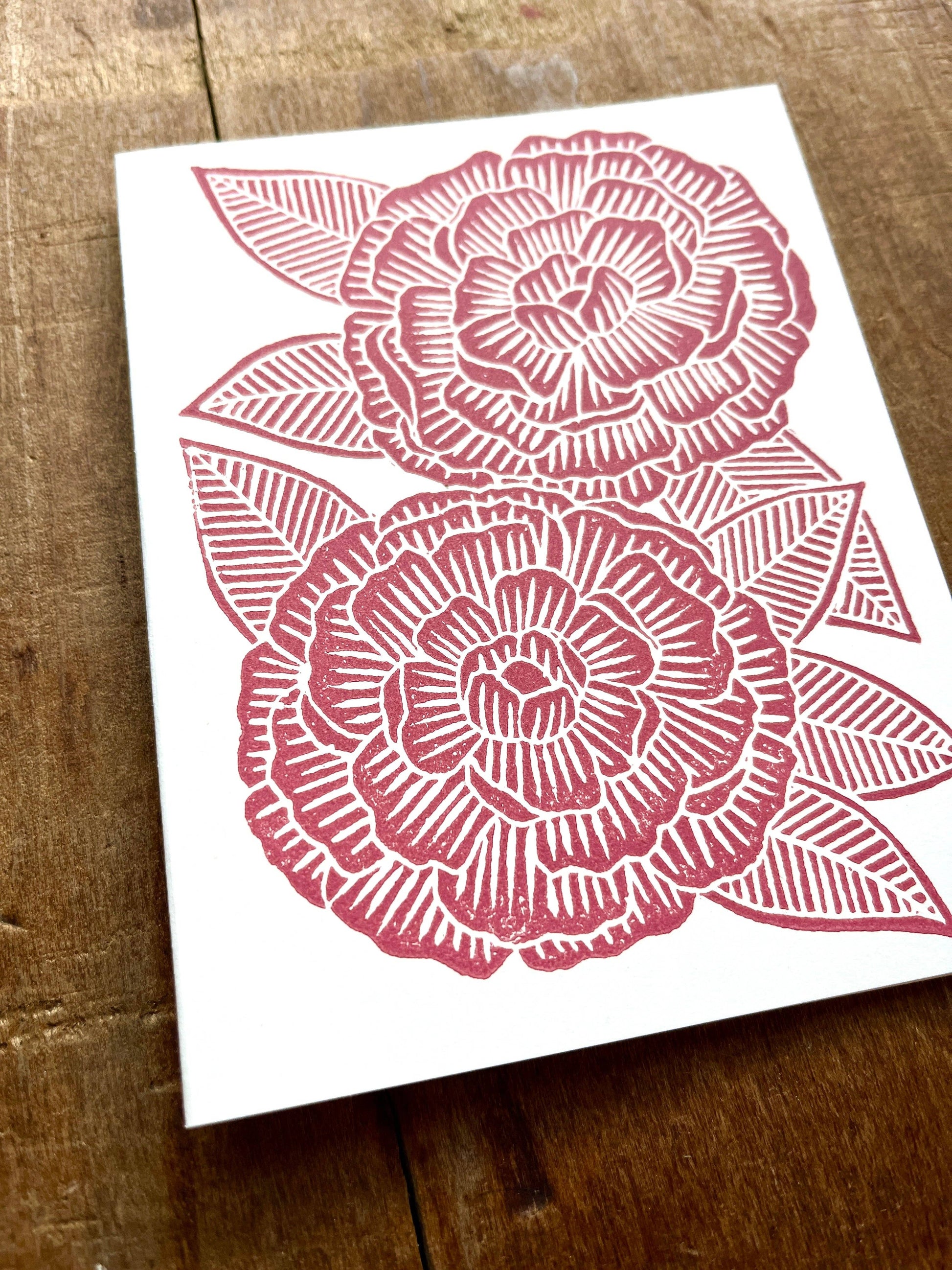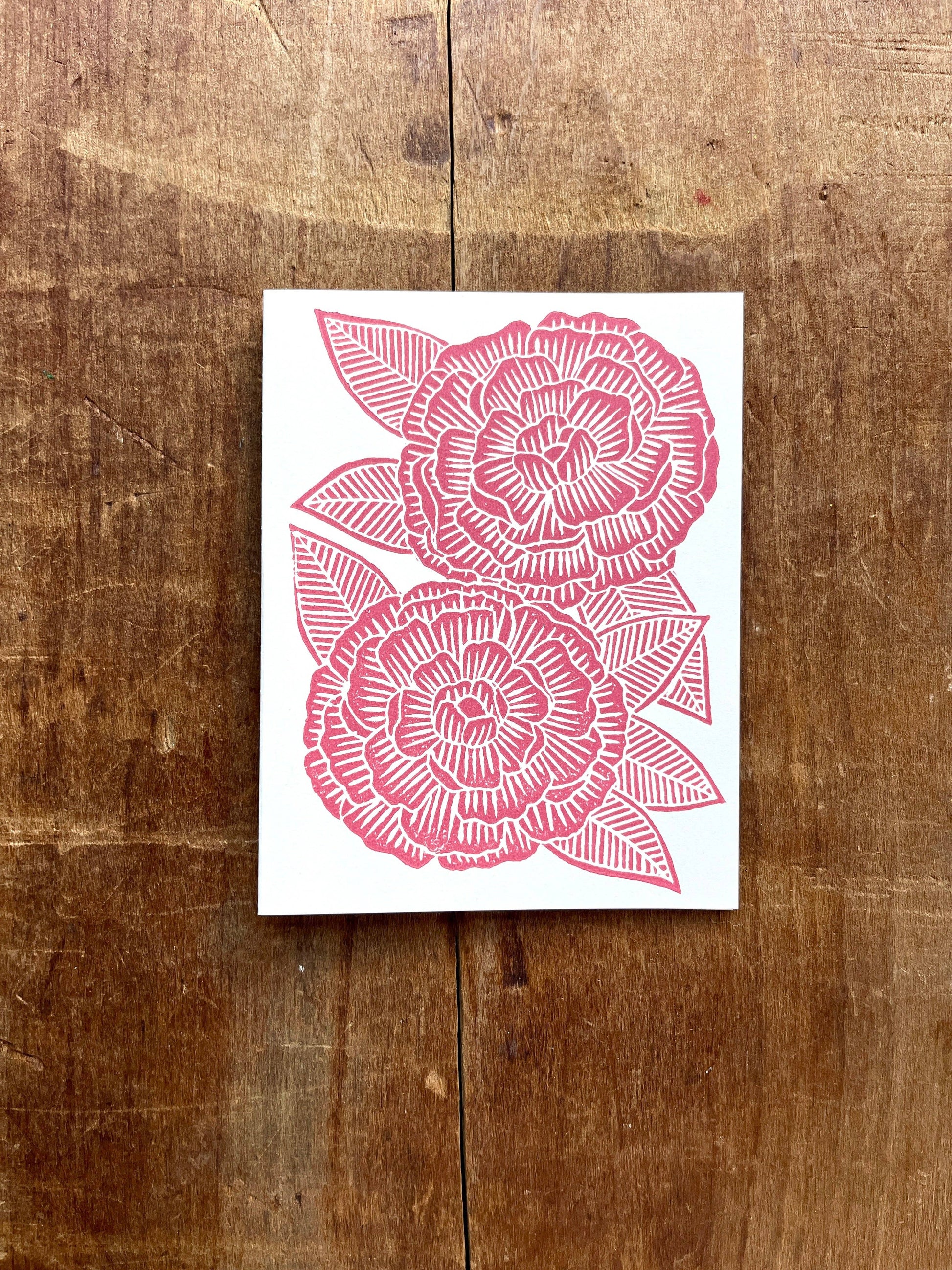 Each card is individually printed with oil-based ink, using our hand-carved linoleum blocks and our antique Chandler & Price printing press. Because these cards are handmade, small differences in color or printing texture are part of the product. All cards are made with oil-based ink and 100lb cardstock.