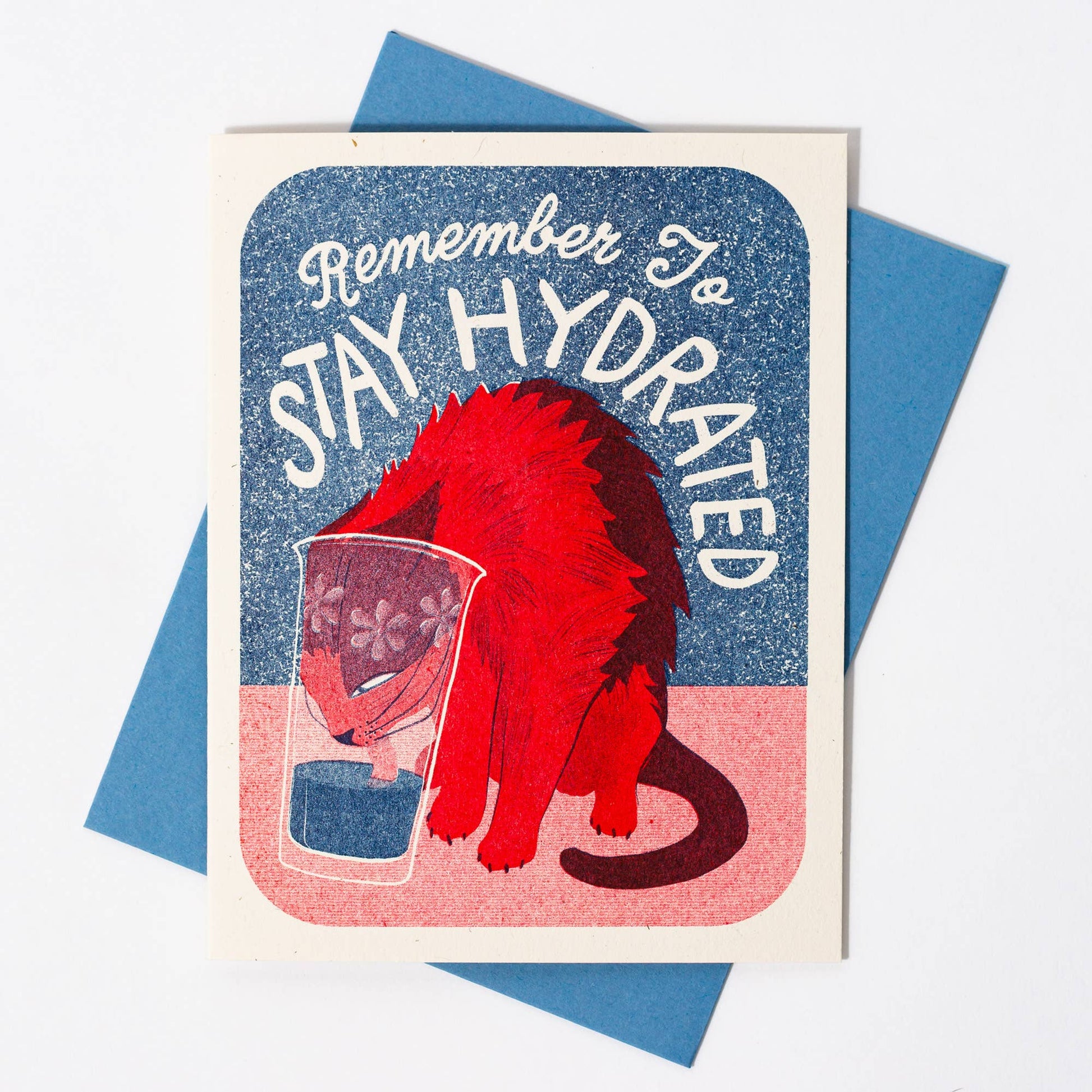 It's hot out there, remember to stay hydrated like this cat, who is having a sip of water from a delicate floral glass. Don't spill! Risograph printed in bright red and federal blue.