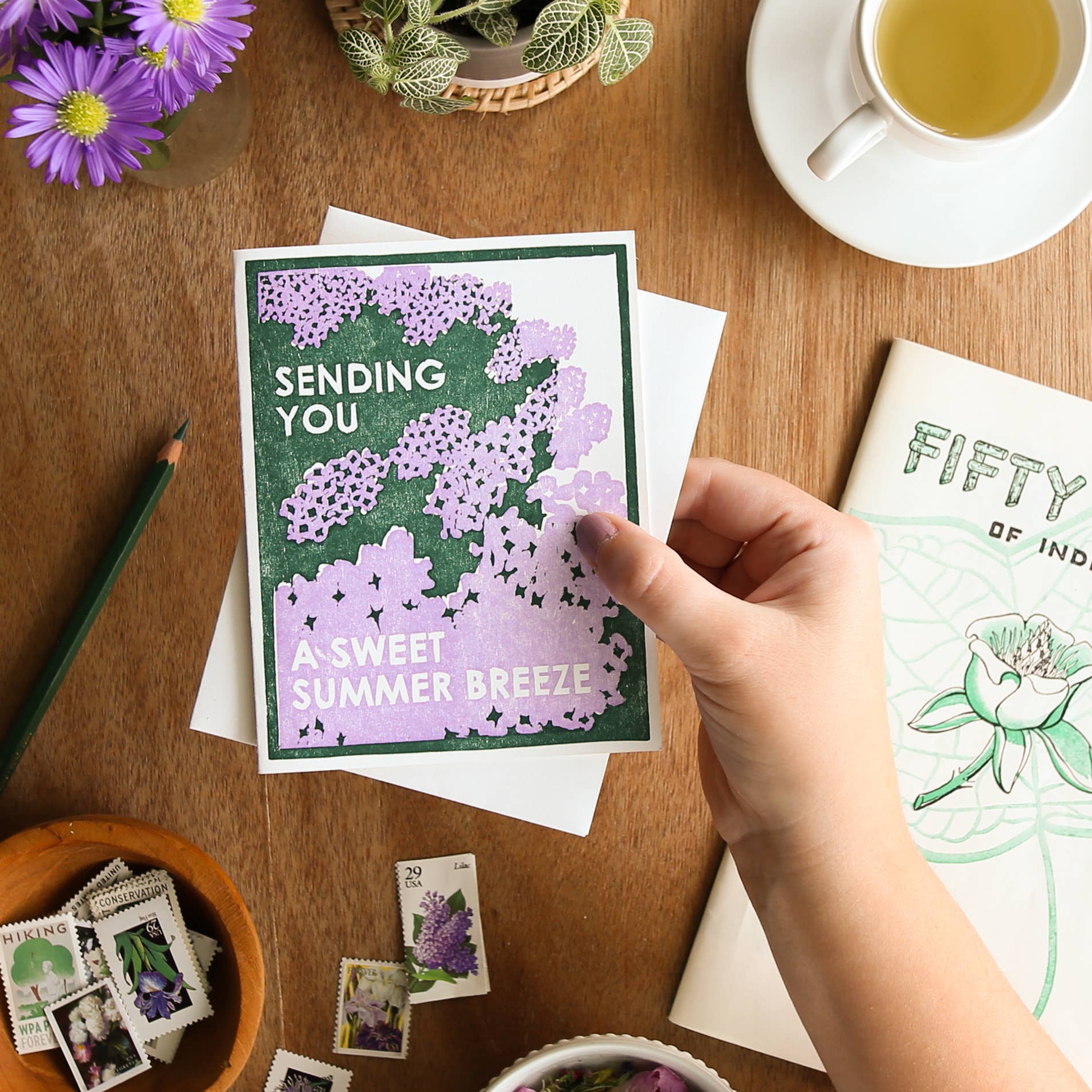 Letterpress, 100% post-consumer recycled paper, A2, blank inside, cello sleeve with envelope.