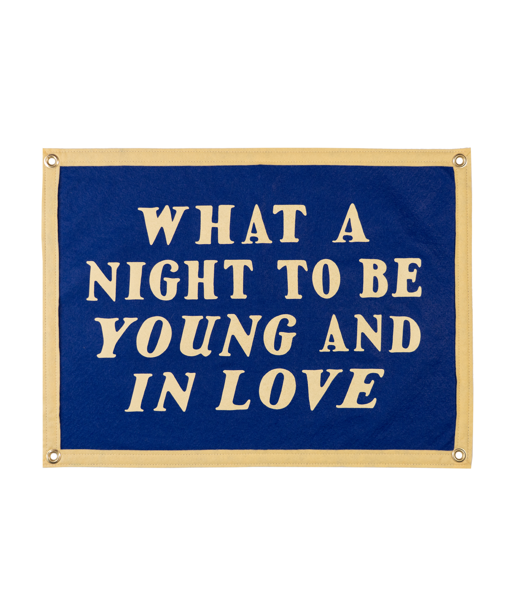 Celebrate love and late nights with this navy wool felt camp flag. A perfect wall piece for weddings, bedrooms, or anyone who remembers what it felt like to fall fast and hard.