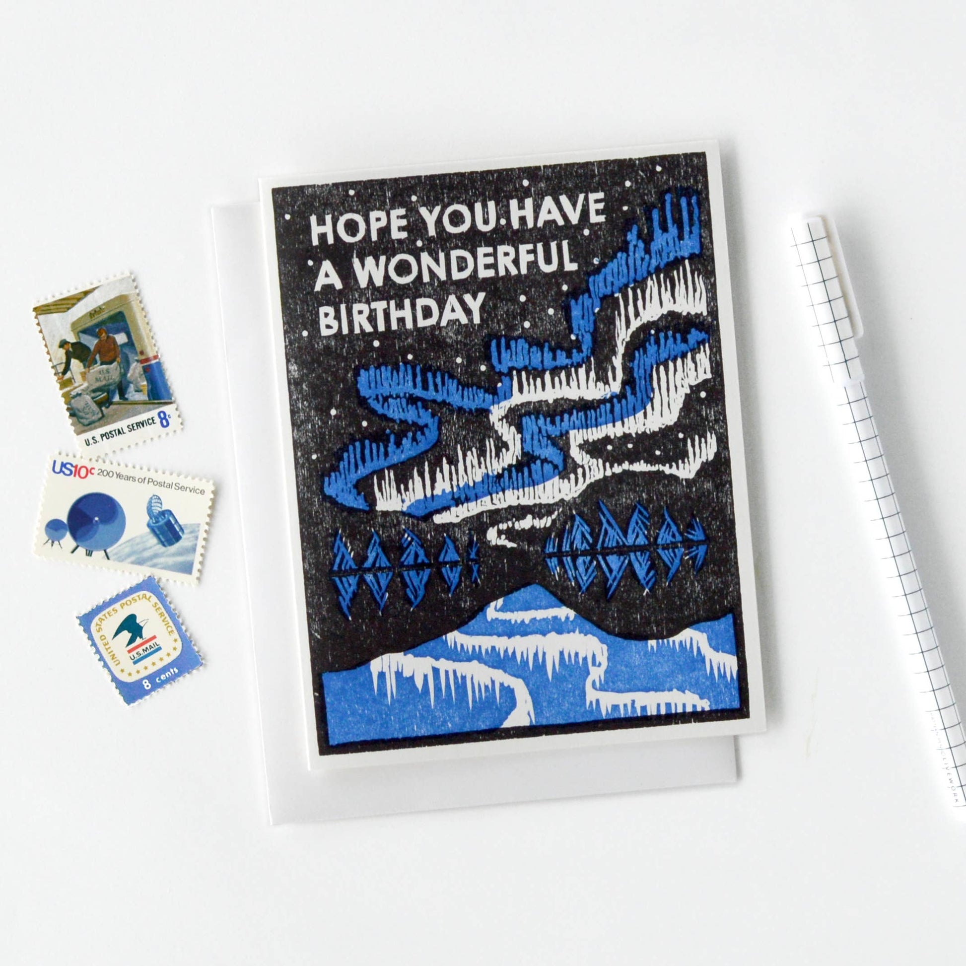 Letterpress, 100% post-consumer recycled paper, A2, blank inside, cello sleeve with envelope.