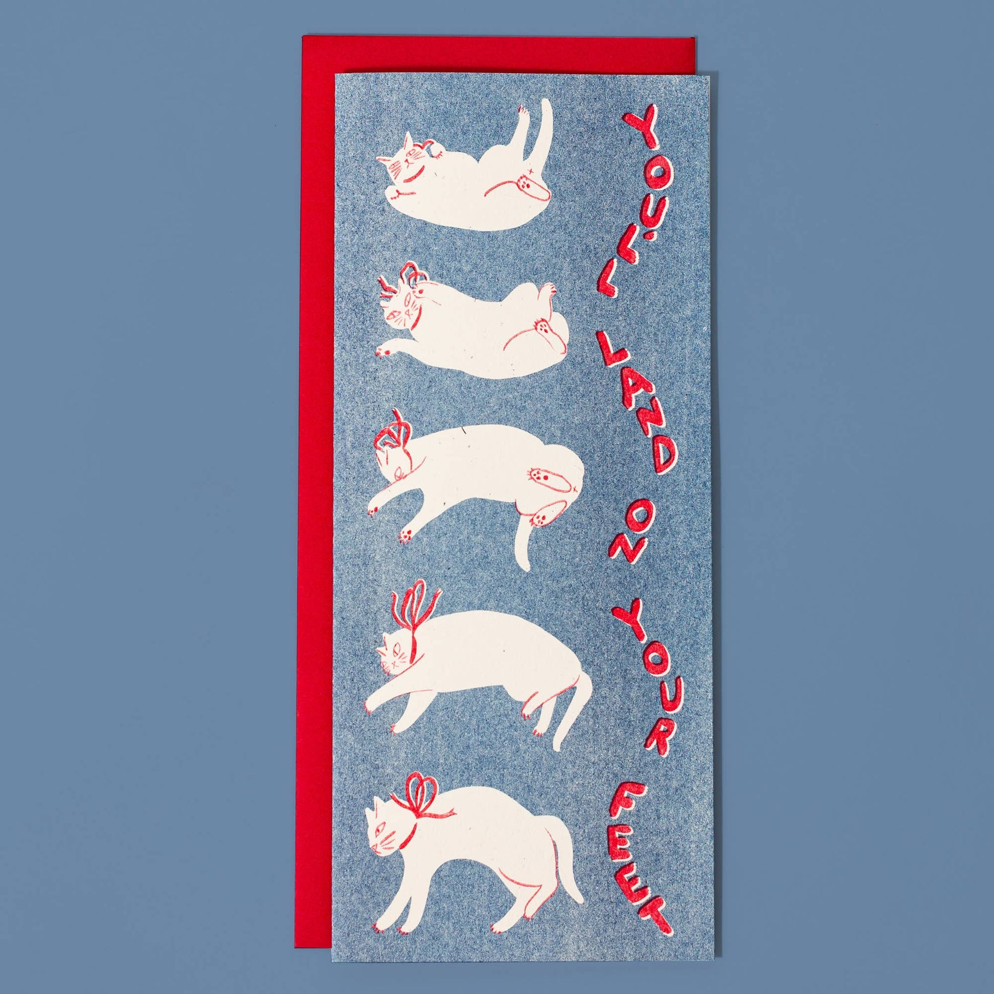 They say a cat always lands on its feet, and here we see one in action doing just that on this extra tall no. 10 size card. The ultimate card to send for encouragement for a friend going through a tough time. Risograph printed in bright red and federal blue.